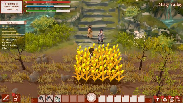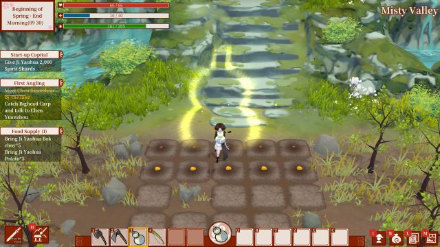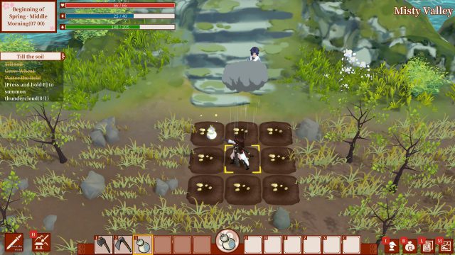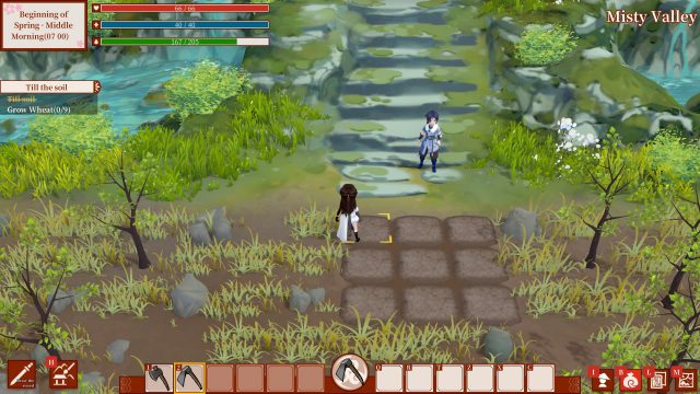 เริ่มต้นจากการปลูกผัก ใช้จอบเตรียมแปลงดินให้พร้อม แล้วหย่อนเมล็ดลงไป จากน้ำก็รดน้ำ อ๊ะๆรดแบบปกติมันธรรมดาเกินไป คุณสามารถใช้วิชาลมปราณเรียกเมฆฝนขนาดเล็ก มารดน้ำเฉพาะแปลงของคุณได้ แต่การใช้วิชาปราณจะเสีย MP อย่าลืมไปเก็บ MP เติมด้วยล่ะ ด้วยการหาผลึกสีฟ้าที่อยู่ตามหมู่บ้าน ส่วนการเซฟได้จากการนอน หรือเซฟที่ผลึกหินก็ได้
