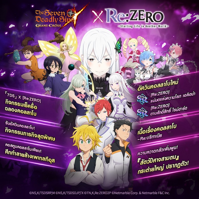เน็ตมาร์เบิ้ล ผู้พัฒนาและให้บริการเกมมือถือคุณภาพสูงชั้นนำ ได้ปล่อยอัปเดต คอลลาโบ 7 บาป X Re:ZERO รีเทิร์น ใหม่ล่าสุดสำหรับเกม The Seven Deadly Sins: Grand Cross ซึ่งแฟน ๆ ต่างรอคอยคอลลาโบสุดพิเศษนี้กันอย่างมาก และการกลับมาตามคำเรียกร้องสุดป๊อปปูล่าในครั้งนี้ถือเป็นภาคต่อของการอัปเดตเมื่อปี 2021 ที่ผ่านมา โดยในรอบนี้ผู้เล่นจะได้พบกับอัศวินใหม่, หลากหลายกิจกรรมในช่วงเวลาสุดพิเศษ, ของรางวัล และอื่น ๆ อีกมากมาย ที่พร้อมให้แฟน ๆ ได้ติดตามและสนุกทวีคูณอย่างต่อเนื่องไปกับคอลลาโบสุดพิเศษนี้อีกครั้ง ห้ามพลาด !
