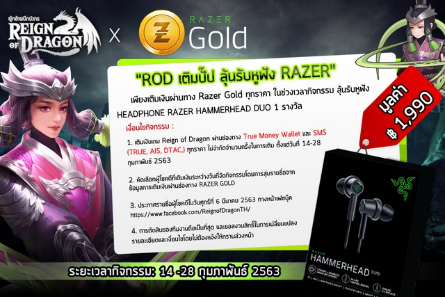 Reign of Dragon ร่วมกับ RAZER GOLD เปิดตัวแคมเปญพิเศษต้อนรับวาเลนไทน์ “ROD เติมปั๊ป ลุ้นรับหูฟัง RAZER” 14-28 กุมภาพันธ์ นี้เท่านั้น!