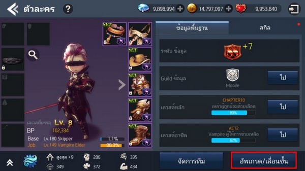 กดที่ไอคอนตัวละครด้านซ้ายบนจอ จะเจอหน้ารายละเอียดตัวละคร เข้าไปที่ [อัพเกรด/เลื่อนขั้น]