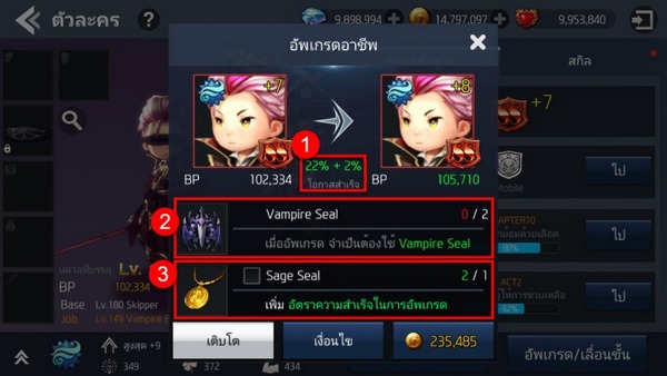 จากนั้นจะเจอกับหน้าต่างรายละเอียดการอัพเกรดอาชีพ และ Seal ที่ต้องการ