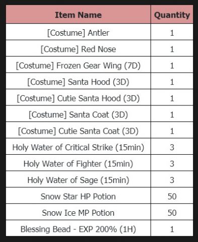โดยมอนสเตอร์แต่ละตัวจะมีไอเทมที่ดรอปแตกต่างกันออกไป Bad Santa, Couple Snowman, Single Snowman ได้ในแผนที่ที่กำหนด