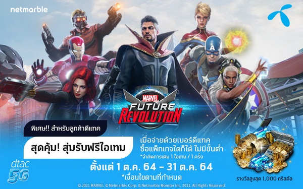 MARVEL Future Revolution จับมือ ดีแทค เอาใจเหล่าฮีโร่ตัวจริง มอบสิทธิพิเศษให้กับลูกค้า ดีแทค พิเศษ! สุดคุ้ม!! สำหรับลูกค้าดีแทค เมื่อซื้อแพ็กเกจใดก็ได้จ่ายด้วยเบอร์ดีแทคแบบไม่มีขั้นต่ำ (จำกัดการเติม 1 ไอเทม / 1 ครั้ง) สุ่มรับไอเทมสุดพิเศษฟรี! ไม่ว่าจะเป็น 1000 คริสตัล, 500 คริสตัล, 300,000 ทอง, 250,000 ทอง, และ 200,000 ทอง มาก่อนได้รับสิทธิ์ก่อน ความพิเศษสำหรับฮีโร่คนพิเศษอย่างลูกค้าดีแทคเท่านั้น ตั้งแต่วันนี้ถึง 31 ตุลาคมนี้!