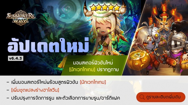 Summoners War ยังขนชุดแปลงร่างสุดน่ารักใหม่เอี่ยมมาฝากเหล่าซัมมอนเนอร์ ไม่ว่าจะเป็น “จอมปีศาจฮาโลวีน”, “นักบวชอสูรฮาโลวีน” รวมถึง “พาลาดินฮาโลวีน” เพื่อฉลองเทศกาลฮาโลวีนกันพร้อมหน้า ไอเท็มธีมฮาโลวีนอย่างตะกร้าลูกกวาดฟักทอง, หน้ากาก, เลื่อยไฟฟ้า ก็จะโผล่เข้ามาสร้างสีสันในเกมด้วย ซึ่งทุกคนสามารถเข้าร่วมกิจกรรมคอมมูนิตี้ในเทศกาลฮาโลวีนได้ตั้งแต่วันที่ 21 ตุลาคมเป็นต้นไป