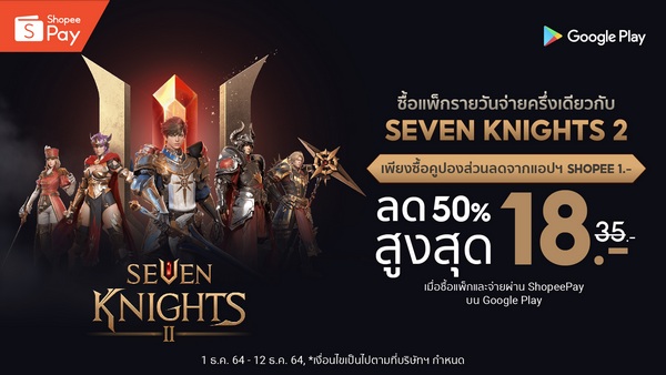 “เซเว่นไนท์ 2” ภาคต่อความยิ่งใหญ่ของเกมระดับตำนาน ฉลองการเปิดตัวสุดพิเศษด้วยการลดสุดโหดเอาใจเหล่าสาวก เฉพาะลูกค้า ShopeePay เท่านั้น! มอบสิทธิพิเศษให้กับลูกค้า ShopeePay ลดสูงสุด 50% กับแพ็กเกจรายวัน ซื้อทุกวัน ลดทุกวัน!! เพียงซื้อคูปองส่วนลด 18.- จาก Shopee ในราคาเพียง 1 บาท แล้วนำไปซื้อแพ็กในเกม “เซเว่นไนท์ 2” ขั้นต่ำ 35.- คลิก > https://weblink.shopeepay.co.th/u/sk218dcdec1 (จำกัดการซื้อวันละ 2 ครั้ง) เมื่อซื้อคูปองเรียบร้อยแล้วเข้าเกมเพื่อซื้อแพ็กเกจ “แพ็กไอเทมการเงินรายวัน” และ “แพ็กเรียกอัศวินรายวัน” แล้วจ่ายผ่าน ShopeePay เพียงเท่านี้ลูกค้าก็สามารถซื้อไอเทมได้จากราคาแพ๊กละ 35 บาท เหลือเพียง แพ็กละ 18 บาท เท่านั้น!! (**อย่าลืมซื้อคูปองส่วนลด ผ่าน ShopeePay ก่อนชำระเงิน**) ไม่รีบไม่ได้แล้ว! ตั้งแต่วันนี้ถึง 12 ธันวาคม นี้เท่านั้น!!