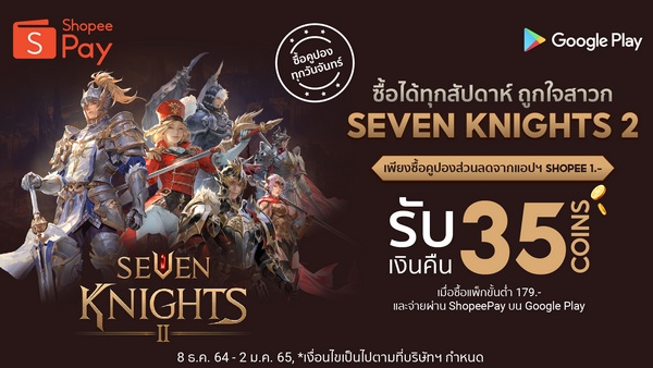 “เซเว่นไนท์ 2” ภาคต่อความยิ่งใหญ่ของเกมระดับตำนาน ฉลองการเปิดตัวสุดพิเศษเพื่อสาวก Seven Knights 2 ที่ใช้ ShopeePay เท่านั้น!! มอบสิทธิพิเศษให้กับลูกค้า ShopeePay เพียงแค่ซื้อคูปองส่วนลดจากแอปฯ Shopee ในราคาเพียง 1 บาท (สามารถซื้อคูปองส่วนลดได้สัปดาห์ละ 2 ครั้ง) แล้วซื้อแพ็กขั้นต่ำ 179 บาท โดยเลือกจ่ายผ่าน ShopeePay บน Google Play รับเงินคืนทันที 35 Coins!! (**อย่าลืมซื้อคูปองส่วนลด ผ่าน Shopee ก่อนชำระเงิน**) ไม่รีบไม่ได้แล้ว! ตั้งแต่วันนี้ถึง 2 มกราคม 2565 นี้เท่านั้น!!