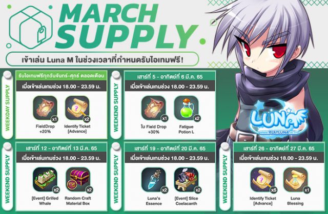Luna M มีนาแล้ว มีไอเทมดีๆใช้รึยัง พบกับกิจกรรมแจกไอเทมฟรี เพียงออกผจญภัยกับเกม Luna M ในวันและเวลาที่กำหนด รับเซตไอเทมแจกฟรี เช่น Fatigue potion L, Luna’s Essence และอื่นๆอีกมากมาย ให้เก็บเวลยาวๆตลอดทั้งเดือน ตั้งแต่วันนี้ถึง 27 มีนาคม 2565 นี้!