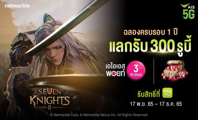 กรุงเทพฯ, ประเทศไทย (22 พฤศจิกายน 2565) – วันนี้ เน็ตมาร์เบิ้ลคอร์ปอเรชั่น ผู้พัฒนาและให้บริการเกมมือถือคุณภาพสูงชั้นนำร่วมมือกับเอไอเอส เพื่อร่วมฉลองการเปิดบริการครบรอบ 1 ปี เกมมือถือแนวสวมบทบาทอัศวินสุดยิ่งใหญ่อย่างเกม เซเว่นไนท์ 2 พิเศษสำหรับลูกค้าเอไอเอสและเอไอเอส ไฟเบอร์ เพียงใช้ เอไอเอส พอยท์ 3 คะแนน แลกรับ 300 รูบี้ ได้เลย! แลกง่ายๆ ได้ที่ แอป myAIS หรือคลิก https://m.ais.co.th/wxH68ldC1 อย่ารอช้า เพียง 5,000 สิทธิ์แรกเท่านั้น ตั้งแต่วันนี้ – 17 ธ.ค. 65 หรือจนกว่าสิทธิ์จะหมด ห้ามพลาด!