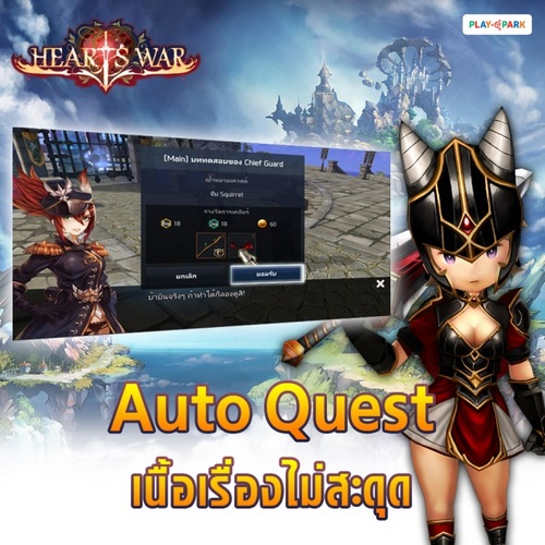 เมื่อเกม HeartsWar มีเนื้่อเรื่องที่เข้มข้นและน่าสนใจ จึงทำให้เราไม่ควรพลาดกับการทำเควสต์ต่างๆ อย่างแน่นอน เพราะ Auto Quest จะเป็นส่วนนึงที่ทำให้เราสามารถเดินเรื่องได้อย่างเต็มที่ไม่มีสะดุด