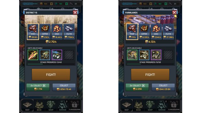 นอกจากการเล่นในด่านต่างๆ เพื่อฟาร์มของแล้ว คนเล่นยังจะสามารถฟาร์มของได้จากการสร้างฐานอีกด้วย โดยฐานนั้นจะช่วยผลิตของมาให้คนเล่น ยิ่งเมื่อคนเล่นต้องการอัพเกรดรถถังไประดับสูงเท่าไหร่ยิ่งต้องใช้ของเยอะ และฐานยังช่วยผลิตชิ้่นส่วนรถถังคันใหม่ๆ ให้คนเล่นได้ปลดล็อคอีกด้วย (แต่ช้า จะเอาไวๆ คือเติมเงิน)