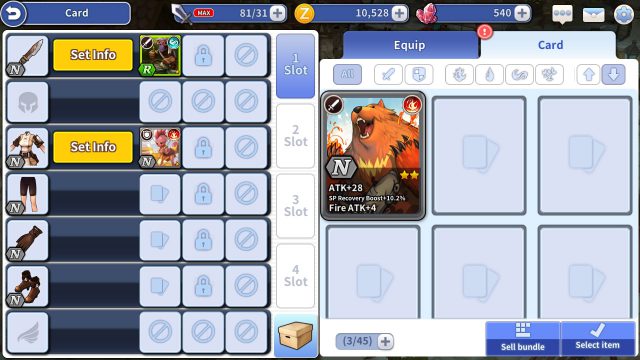 นอกจากนี้อีกระบบเด่นก็คือระบบการ์ด โดยเกมนี้อาวุธจะไม่มีระบบธาตุ ธาตุจะไปอยู่ในการ์ด ซึ่งคนเล่นจะสามารถสวมใส่อาวุธเพื่อให้มีพลังของธาตุนั้นๆ ได้จากการ์ด และการ์ดก็สามารถอัพเกรดเพื่อข้ามระดับไปเกรดสูงได้ แน่นอนว่าการ์ดระดับดีๆ ย่อมหาได้จากกาชานั่นเอง