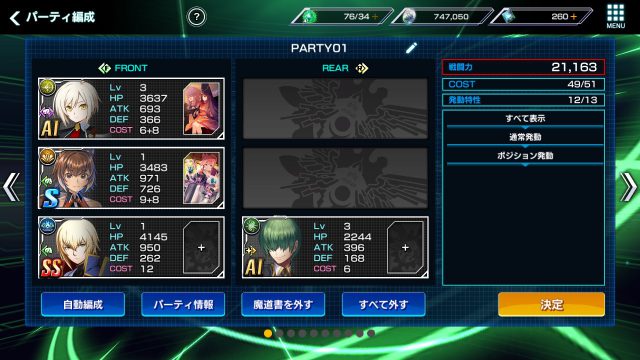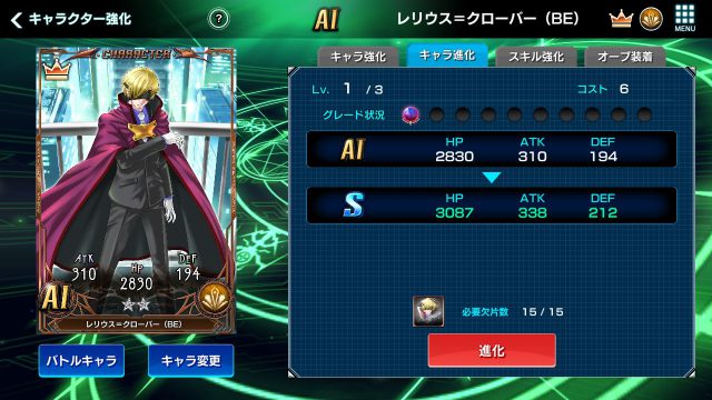 ยิ่งตัวละครระดับเกรดดีหรือการ์ดระดับสูงก็จะเพิ่มสเตตัสให้มาก แต่ขณะเดียวกัน ก็จะใช้ Cost ที่สูงมากขึ้นไปด้วย แต่หากอัพเลเวลไปก็จะเพิ่มจำนวน Cost ที่รองรับ ซึ่งก็จะทำให้ใส่การ์ดและตัวละครที่มากขึ้นได้ไปอีก แน่นอนว่าตัวละครและการ์ดนั้นจะมีการอัพเกรดได้ หลักเดียวกันกับเกม RPG มือถือปกติ ใช้ EXP อัพ และเศษสำหรับการเพิ่มระดับตัวละคร