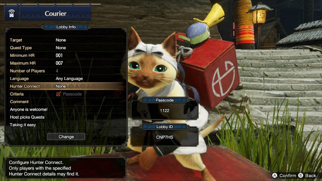หากเราตั้งห้องเอง ให้เลือก Create a Lobby > ตั้งรหัสผ่านให้เรียบร้อย เมื่อตั้งเสร็จคุยกับแมวกล่องอีกครั้งเลือกคำสั่ง Lobby Settings จะมี Lobby ID ส่ง Lobby ID ให้เพื่อน เพื่อให้เพื่อนสามารถเข้าห้องเราได้ แต่หากเราจะไปร่วมห้องเพื่อน ให้เพื่อนส่ง Lobby ID แล้วเราหาจาก Search by Lobby ID ได้เช่นกัน