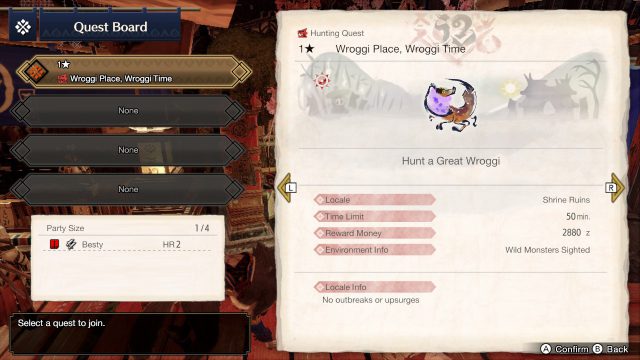 – Village Quest : เควสหมู่บ้าน ที่สามารถรับเควสได้ที่ Hinoa กลางหมู่บ้าน โดยเควสหมู่บ้านจะเป็นเควสที่เล่นคนเดียว ซึ่งส่วนใหญ่เป็นเนื้อเรื่องหลักของเกม รวมทั้งปลดล็อคฟังก์ชั่น หรือท่าพิเศษอื่นๆ ส่วนมากก็มาจากเควสหมู่บ้าน