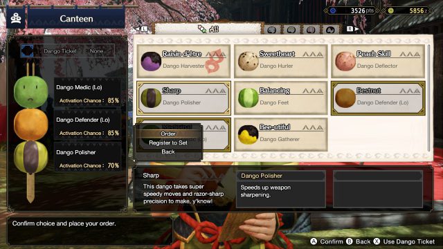 3. ก่อนเริ่มเควส อย่าลืมไปกินข้าวแมวหรือดังโงะทุกครั้ง โดยไปที่ Canteen เลือกดังโงะที่ต้องการ โดยดูว่าดังโงะแต่ละประเภทจะให้ผลบัฟแบบไหน ช่วงแรกแนะนำให้เลือกที่เพิ่มพลังชีวิต พลังป้องกันหรือโจมตีไว้ก่อน และอย่าลืมเซฟไว้เพื่อให้สามารถกดใช้งานได้ทันที แล้วชีวิตจะง่ายขึ้นเยอะ