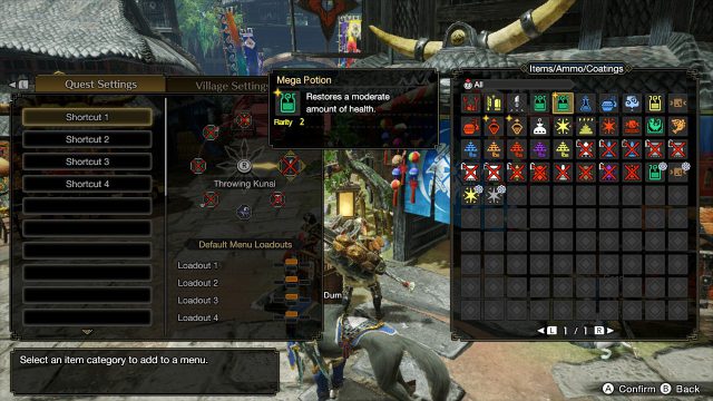 – Short Cut เตรียมไอเทมก่อนสู้ : ไปที่ลังเก็บไอเทม(Item box) เลือกคำสั่ง จากนั้นหยิบไอเทมที่ต้องการเซตใส่ให้เรียบร้อย แล้วออกมากดคำสั่ง Manage Items >Item Loadouts และกดปุ่ม X เพื่อตั้งค่าเซตไอเทมไว้ เมื่อเวลาใช้ให้กดคำสั่ง Item Loadouts ได้เลย ไม่ต้องเสียเวลาจัด ซึ่งสามารถใช้ได้กับการจัดเซตอุปกรณ์ได้เช่นกัน