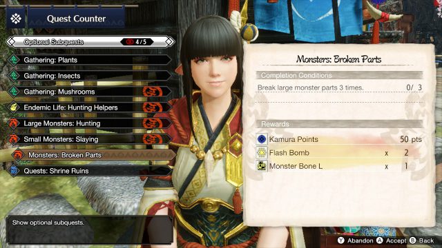 22. อย่าลืม Sub Quest ไปที่ Quest Counter ของหมู่บ้านเลือก Optional Subquests แล้วรับเควสมาทำรอบละ 5 เควสเพื่อรับไอเทมสนับสนุนมากมายไปพร้อมๆกับการทำเควสหลัก