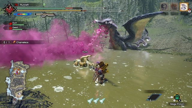 Chameleos มังกรโบราณดั้งเดิมที่มีมาตั้งแต่ภาค 2 โดยจะต้องเล่นให้มี HR ถึง 20 ก่อนจึงจะปลดล็อคเควสได้ โดยเจ้า Chameleos เป็นกิ้งก่าที่สามารถพรางตัวให้เข้ากับสิ่งแวดล้อมได้ และยังสามารถสร้างลมและพิษได้อย่างรุนแรง นั่นทำให้นักล่าสายระยะประชิดค่อนข้างที่จะสู้ลำบาก เนื่องจากว่าผิวหนังส่วนใหญ่จะเป็นส่วนหนา แม้ฟันเข้าแต่ก็เบา จำเป็นต้องเน้นโจมตีที่ส่วนหัวและหาง แถมยังมีลมออกจากหางด้วย แต่สายปืนจะค่อนข้างสู้ง่าย ทั้งกระสุนเจาะ กระสุนระเบิดประเคนเข้าไปรับรองรู้เรื่อง นอกจากนี้ยังคงต้องระวังพิษที่รุนแรงเอามากๆแถมยังสามารถบังคับทิศทางพิษได้ด้วย
