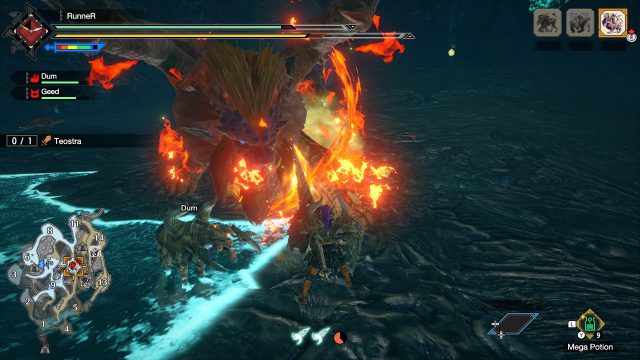 Teostra มังกรโบราณเจ้าของฉายา The Emperor of Flame จำเป็นต้องมี HR ถึง 40 ก่อน จึงจะปลดเควสได้ เจ้าเทโอนี้เก่งสุดในมังกรโบราณทั้ง 3 ตัวเลยก็ว่าได้ ทั้งความแรง ท่าสุดกวนที่โจมตีได้หลายระยะ แถมแทบทุกองศา แล้วยังมีออร่าไฟคลุมร่างยามมันโกรธ ทำให้นักล่าเสียพลังชีวิตไปเรื่อยๆเมื่ออยู่ใกล้มันเหมือนไฟลุกติดตัว และอีกหนึ่งไม้ตาย ซุปเปอร์โนวา ที่รุนแรงเอามากๆ มันจะเริ่มนับเวลายามเมื่อมันโกรธเมื่อเวลาหนึ่งมันจะระเบิดออกมาไม่มีปี่ไม่มีขลุ่ย จึงต้องระวัง การเอาสกิลกันไฟมาจะช่วยได้มาก หรือกินดังโงะเพิ่มผล ป้องกันการตายทันที และอย่าลืม! อัพเกรดเกราะจนถึง LV สูงสุดด้วย และวิธีที่ดีที่สุดในการกำจัดคือ หาพรรคพวกมารุมยำซะ หรือขี่มอนสเตอร์ตัวอื่นๆเข้ามาโจมตีเพื่อตัดกำลัง