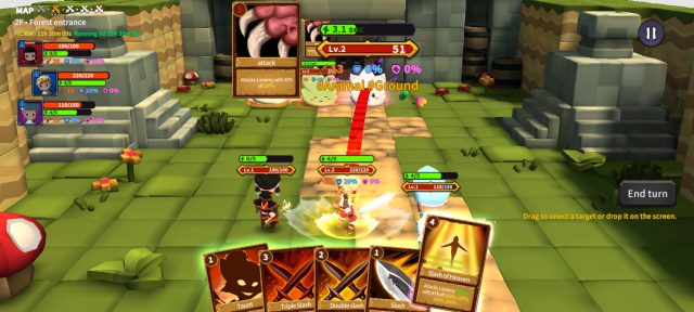 เมื่อเข้าสู่ชั้นมอนสเตอร์ จะมีเกจความเร็วของตัวละคร เมื่อเกจเต็มจะได้เล่นเทิร์นเล่น เมื่อเริ่มเทิร์นจะจั่วการ์ดมา 5 ใบ และฟื้นฟู AP จำนวนหนึ่ง การใช้การ์ดจะต้องจ่าย AP ตามจำนวนค่าร่ายของการ์ดใบนั้นๆ โดยการ์ดแต่ละใบจะมีความสามารถที่แตกต่างกัน ไม่ว่าจะโจมตี ใช้เวทย์ฟื้นฟู หรือสกิลพิเศษต่างๆ