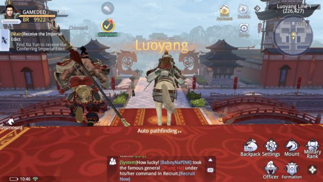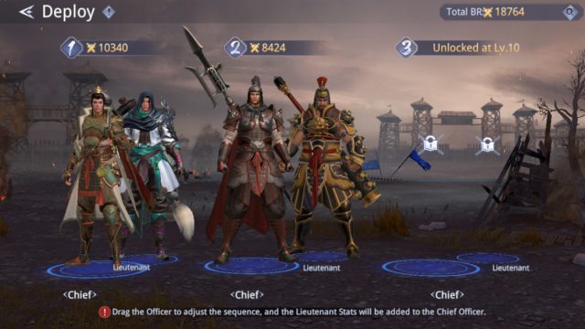 เกมมีระบบกาชาที่จะสุ่มขุนพลสามก๊กมาให้เล่น ซึ่งคนเล่นจะสามารถใส่จัดทีมได้อิสระและเน้นในการอัพเลเวลเป็นหลัก อีกทั้งยังสามารถเพิ่มสเตตัสต่างๆ ได้ทั้งจากการอัพส่วนอื่นเช่นพาหนะ ทำให้การอัพเกรดตัวละครเกมนี้ไม่ยุ่งยากและง่ายดาย