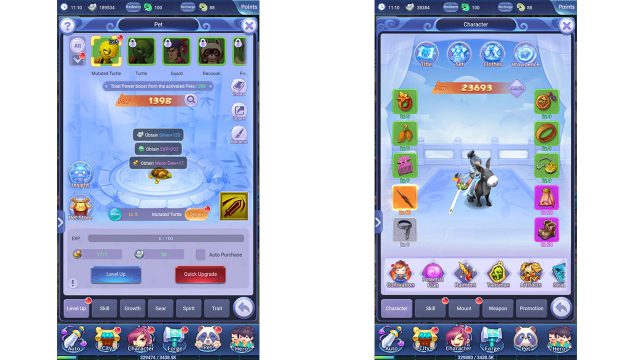 เกมจะมีการพัฒนาหลายอย่าง ทั้งในส่วนของเลเวลตัวละคร, อุปกรณ์, สกิล รวมไปถึงสัตว์เลี้ยง หรือง่ายๆ ว่าคนเล่นจะสามารถอัพเกรดทุกอย่างแล้วก็จะมีการเพิ่มพลังให้กับตัวละครทั้งหมดเอง ทุกอย่างจะเกื้อหนุนกันและถ้าอยากให้ตัวละครเก่งก็ต้องอัพให้หมด