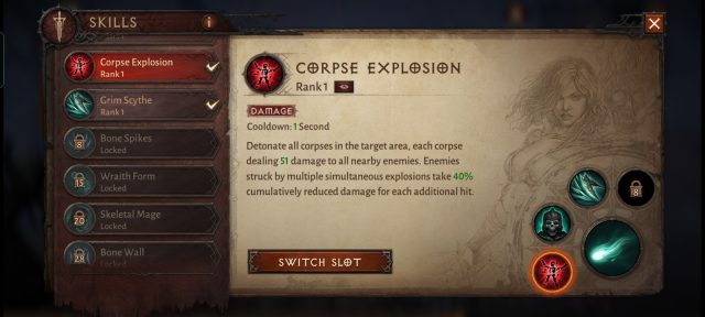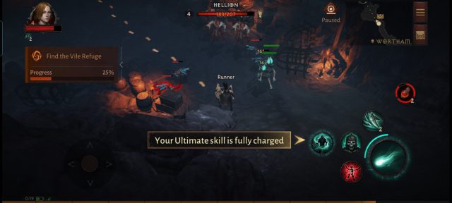 สำหรับสกิลจะคล้ายกับ Diablo III โดยจะสามารถเลือกสกิลมาใส่ใน Skill slot ได้สูงสุด 4 ช่อง โดยแบ่งเป็น Primary Attacks (สกิลโจมตีหลัก) และ Skills (สกิลโจมตีเสริม) ซึ่งสกิลต่างๆจะปลดล็อคเมื่อ LV ถึงตามที่กำหนด เราสามารถสลับเปลี่ยนสกิลได้ตามใจชอบ นอกจากนี้ยังมี Ultimate เมื่อสะสมพลังงานจนครบแล้ว จะสามารถปลดปล่อยท่าพิเศษที่ทรงพลังได้