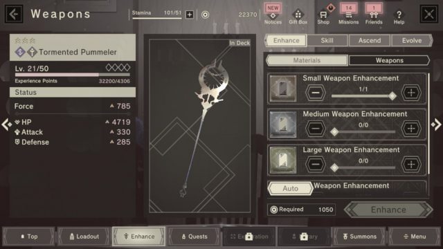 ระบบอัพเกรดของเกมนี้ จะสามารถใช้อุปกรณ์ระดับล่างๆเอามาเป็นวัตถุดิบในการอัพเกรดได้ และวัตถุดิบในการหาของมานั้นจะต้องเล่นผ่านเควสท้าทายต่างๆเพื่อเป็นการฟาร์มตัวละครไปในตัว โดยปกติแล้วในเนื้อเรื่องหลักเกมจะมีการใช้ตัวละครหลักของเนื้อเรื่องนั้นมาเล่น แต่ตอนเล่นด่านย่อยจะจะต้องใช้ทีมของเรา ตรงนั้นแหละที่จะทำให้เป็นตัวกำหนดว่าคนเล่นจะเล่นผ่านได้ง่ายหรือไม่ได้