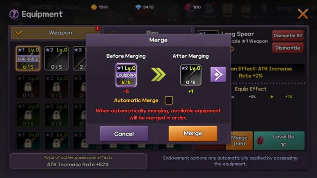 นอกจากนี้การสวมใส่อุปกรณ์ยังเป็นอีกหนทางที่จะทำให้ตัวละครมีความแข็งแกร่งขึ้นได้ การได้รับอุปกรณ์นั้นจะต้องเปิดจากกาชาเท่านั้นแต่สำหรับกาชาเกมนี้จะสามารถหามาได้ง่ายเอามากๆ เรียกได้ว่าแป๊บเดียวก็สามารถสะสมได้เป็นหลักพันหลักหมื่นแล้ว