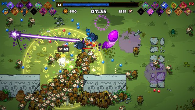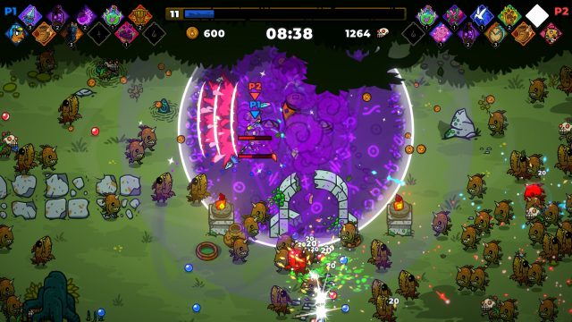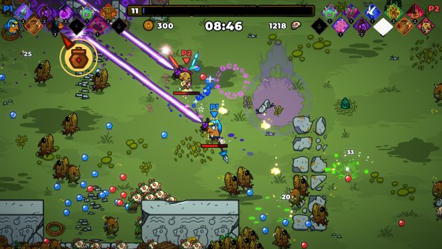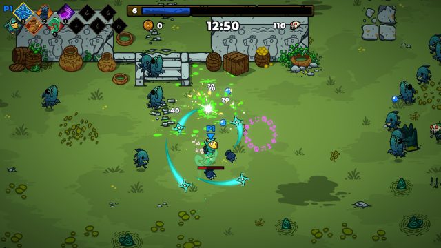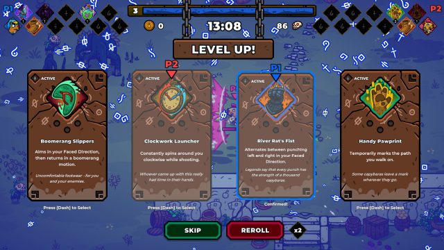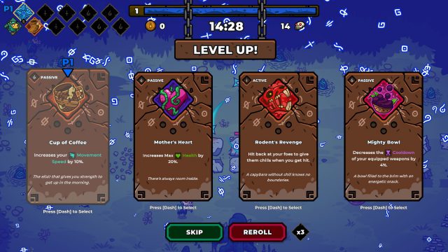 เมื่อ LV Up จะได้เลือกสกิลทั้งหมด 4 อย่าง แบ่งเป็น [Activate] คือสกิลโจมตี และ [Passive] สกิลแบบเสริมพลัง ซึ่งสกิล Activate จะโจมตีอัตโนมัติตาม Cooldown หรือตามเงื่อนไข กด Space ค้างเพื่อเลือกสกิล หรือรีโรลใหม่หากต้องการเปลี่ยนแต่หาก Lv Up แล้วมีสกิลเดิมให้เลือกจะเป็นการเพิ่ม Lv ให้กับสกิล (กด Space 1 ทีเพื่อดูค่าพลังที่เพิ่ม) ทุกสกิลสามารถเพิ่มได้ 5 LV แต่หากเล่นหลายคนจะต้องเลือกแบบแชร์กันคือ ถ้าเล่น 2 คนก็เลือกได้คนละอัน ถ้า 4 คนคงต้องตกลงกันให้ดีก่อน ส่วนหากตายจะต้องฆ่ามอนสเตอร์ในวงกลมคืนชีพ ถึงจะคืนชีพเพื่อนขึ้นมาได้
