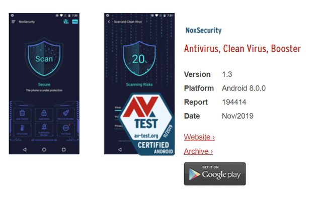 เดือนพฤศจิกายน 2019 ทางทีม Av-Test ได้ทดสอบแอพสแกนไวรัสจากทั้งหมด 21 แอพ ไม่ว่าจะเป็น Avast, AVG, Quick Heal และแอพอื่นๆซึ่งก็เป็นแอพที่ตรวจสอบแล้ว มีความน่าเชื่อถือและดีสำหรับผู้ใช้ แต่ใน List รายชื่อเหล่านี้ก็มีแอพตัวใหม่อย่าง NoxSecurity ซึ่งโดดเด่นที่สุด เพราะว่าได้รับคะแนนเต็มจากทาง Av-Test เพราะแอพ NoxSecurity นั้น มีประสิทธิภาพสูงสุดในการป้องกันไวรัส สามารถดูข้อมูลเพิ่มเติมของ NoxSecurity ได้ที่นี่ มันเป็นแอป 5 อันดับแรกในประเภทเครื่องมือใน Google Play Store มีผู้ใช้มากกว่า 10 ล้านคน และได้คะแนน 4.8 จากรีวิวของผู้ใช้