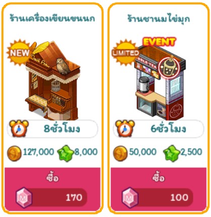 แผงลอยใหม่สุดว้าว! ร้านเครื่องเขียนขนนก และ ร้านชานมไข่มุก มาแต่งเติมห้องสมุดของเรา ยกขบวนแผงลอยใหม่มา ถึง 2 แบบ ซึ่งแผงลอยทัั้งสองแบบ สามารถซื้อได้ที่เลเวล 25