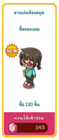 ลูกค้ากระเป๋าหนักซื้อสินค้าเพียบกว่า 120 ชิ้น! “สาวแว่นห้องสมุด” สาวสวยสุดน่ารักที่คลั่งไคล้การอ่านหนังสือ จะมาในแพทช์ใหม่นี้ โดยเธอจะซื้อสินค้ามากถึง 120 ชิ้น! เรียกได้ว่าเหมากันหมดชั้นวางของเลยล่ะ! โดยสามารถซื้อสัญญาได้ตั้งแต่ เลเวล 25 ในราคา 145 รูบี้ เท่านั้น! เมื่อซื้อสัญญาแล้ว ผู้เล่นสามารถใช้ทอง 25,000 เหรียญ ในการเชิญสาวแว่นห้องสมุดมาที่ร้าน และมีระยะเวลาคูลดาวน์ 7 ชั่วโมง 30นาที