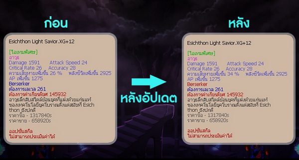 หลังอัปเดต ค่าความเสียหายเพิ่มขึ้น / ความเสียหายลดลง ของชุด Esichthon จะเพิ่มขึ้น ตัวอย่าง
