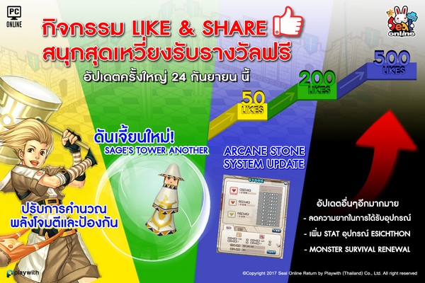 กิจกรรมเพื่อทุกคน เพียงกดไลก์และกดแชร์โพสต์กิจกรรม ในเฟสบุ๊คแฟนเพจ Seal Online Return – Playwith Thailand เมื่อทุกคนสามารถทำยอดได้ถึงตามที่กำหนด รับไอเทมฟรีทุกคนยกเซิร์ฟเวอร์ ตั้งแต่วันที่ 18 – 24 กันยายน 2563