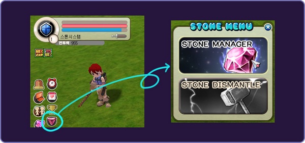 หน้าต่างเมนูของระบบ Arcane Stone เป็นรูปสามเหลี่ยมคว่ำ จะถูกเพิ่มทางด้านซ้ายของหน้าจอเมนู เมื่อคุณคลิกไอคอน คุณจะสามารถเสริมแกร่งและเปลี่ยน Arcane Stone ได้ โดยการใช้เมนู STONE เพื่อแยกชิ้นส่วนอัญมณีเพื่อรับวัสดุต่างๆ