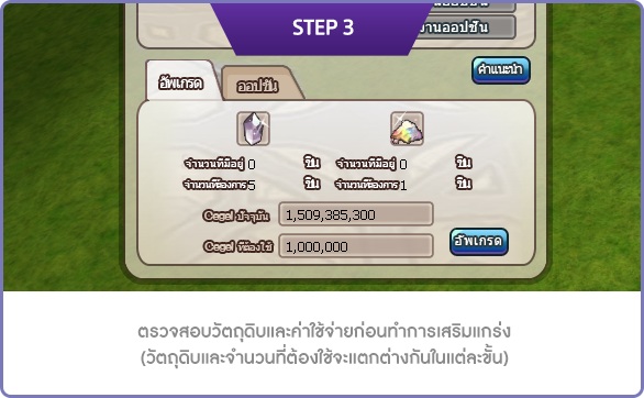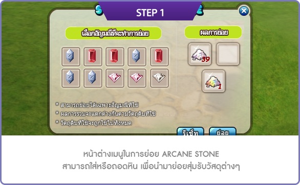 การย่อยอัญมณีที่มีอยู่ (Crystal, Ruby, Diamond, Pink Diamond) เพื่อรับวัตถุดิบใหม่ๆ เพื่อที่จะนำมาใช้อัปเกรด Arcane Stone และเมื่ออัปเกรด Arcane Stone ทั้ง 3 สี จะได้รับออพชั่นพิเศษเฉพาะ ของแต่ละ Stone นั้นๆ เพิ่มเติม