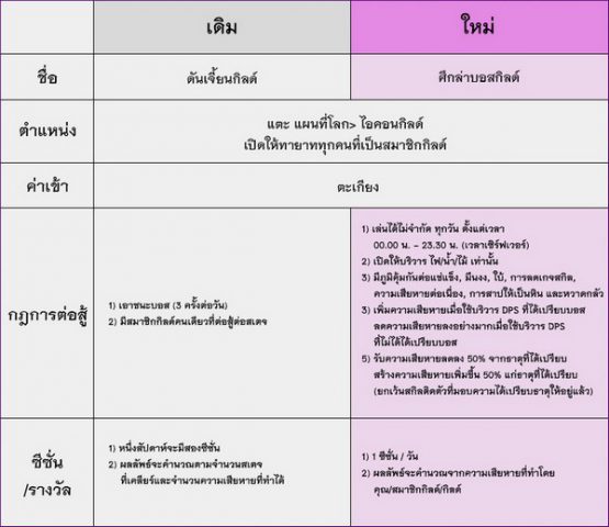 อัปเดต ศึกล่าบอสกิลด์ จากเดิม ดันเจี้ยนกิลด์ เป็น ศึกล่าบอสกิลด์ โดยเพิ่มกฎการต่อสู้ขึ้นเพื่อรองรับการต่อสู้ที่มากขึ้น รางวัลก็มากขึ้นด้วย! จากเดิมที่ซีซั่นนึงจะมี 2 ครั้งต่ออาทิตย์ แต่ใหม่จะเป็น 1 ซีซั่น ต่อวัน! รับรองว่าทุกคนจะต้องรักอัปเดตนี้ >,<