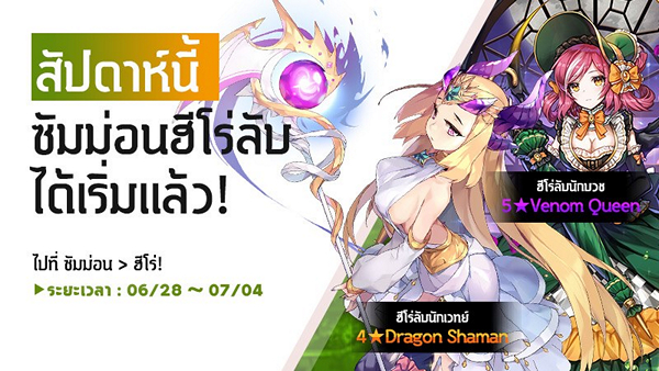 อัปเดตฮีโร่ลับ 5★ Venom Queen ธาตุพืช สายนักบวช ซัพพอร์ตเกิร์ลสายบัฟและดีบัฟ! สามารถช่วยทีมด้วยการเพิ่มพลังโจมตี และล้างค่าสถานะผิดปกติทั้งหมดออกได้ แถมยังมีพิษที่สร้างความเสียหายต่อเนื่องได้ดีมากๆ ดีบัฟสุดปังอีกอย่างคือ สโลว์ เป็นสายนักบวชที่บู๊ได้ดีตัวหหนึ่งเลยล่ะ! พร้อมฮีโร่สาวสวยเซ็กซี่มีดีที่ดาเมจสุดปัง Dragon Shaman ระดับ 4 ดาวกลับมาแล้ว!
