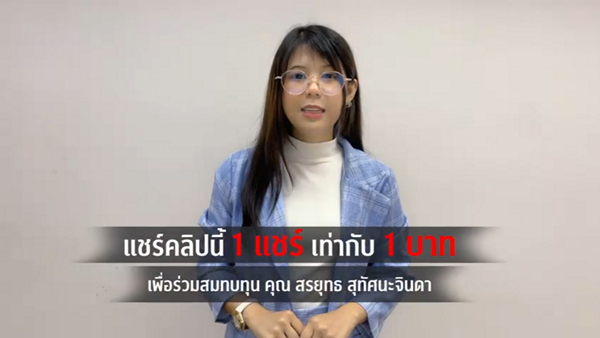 โดยทุกๆ การแชร์คลิปนี้ 1 ครั้งจะเท่ากับบริจาคเงิน 1 บาท ซึ่งยอดทั้งหมดจะถูกสบทบทุนโครงการ “เรื่องเล่าเช้านี้ช่วยผู้ประสบภัยโควิด-19” ของคุณ สรยุทธ สุทัศนะจินดา
