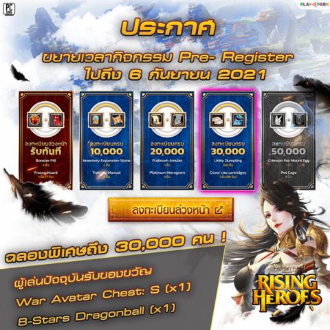 พิเศษ! ขยายระยะเวลาลงทะเบียนล่วงหน้าไปจนถึงวันที่ 6 กันยายน 2564 ทุกคนที่ลงทะเบียนจะได้รับไอเทม Booster Pill 3 ชิ้น และ Frozen Hoard 1 ชิ้น (7 วัน) และหากมียอดลงทะเบียนครบตามเป้าหมายที่กำหนด รับไอเทมสุดพิเศษเพิ่มไปเลยอีกเพียบ! ดูรายละเอียดของรางวัลและลงทะเบียนล่วงหน้าได้ที่ > https://bit.ly/3y4vuJb