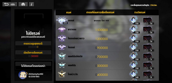 รายละเอียดของรางวัลประจำสัปดาห์: รางวัลแรงค์ประกอบไปด้วยอวาตาร์ตราสัญลักษณ์, ลูมแอมเบอร์และวัตถุดิบอัปเกรด โดยของรางวัลสูงสุดจะแสดงไว้อยู่ในข้อมูลอันดับภายในเกม