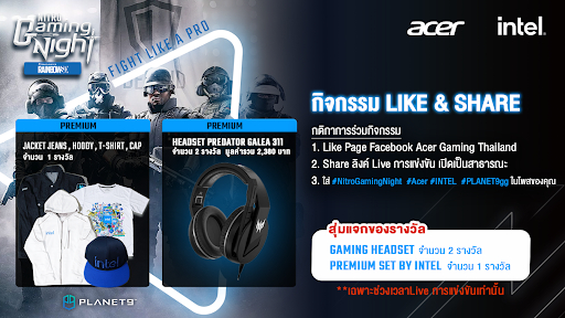 รายละเอียดของรางวัล : สุ่มแจก Headset Predator Galea 311 จำนวน 2 รางวัล กับ Premium Set By INTEL ที่ประกอบไปด้วย Jacket Jeans, Hoody, T-Shirt, Cap แจกครบให้เลย อย่างละ 1 ชิ้น จำนวน 1 รางวัล และประกาศผลผู้โชคดีหลังจบ Live