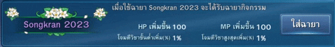 ตีมอนสะสมไอเทม ดอกมะลิ และ เข็มร้อยมาลัย นำไปคราฟเป็นไอเทม “พวงมาลัย” เพื่อแลกรับของรางวัลที่ร้านค้ากิจกรรม เช่น กล่องชุดเกราะสัตว์ยานพาหนะระดับ S, กล่องรองเท้าสัตว์ยานพาหนะระดับ S, เซ็ตสุ่มยุทธภัณฑ์ระดับ S~SR, ยุทธภัณฑ์เต่าดำ/มารฟ้าระดับ A รวมถึงนำไปแลกฉายา “Songkran 2023” เริ่มแล้ว วันนี้ – 18 เมษายน 2566 เพิ่มเติมคลิก https://bit.ly/41elRXz