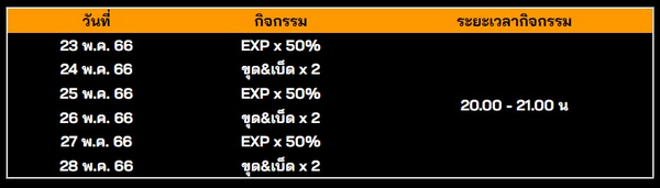 - กิจกรรมคูณ EXP / ตกปลา / ขุด ตามระยะเวลาที่กำหนดในแต่ละวัน