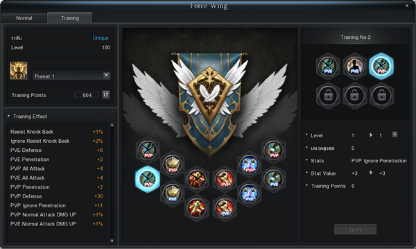 ขยายขอบเขตการใช้งาน เพิ่มจำนวนค่าความสามารถที่เลือกได้ใน Force Wing Training อันเดิม เพิ่มฟังก์ชั่นที่สามารถพรีเซ็ต Force Wing Training ที่สามารถมาใช้ได้ตามสถานการณ์ของ PVP และ PVE - Active Buff Skill ใหม่