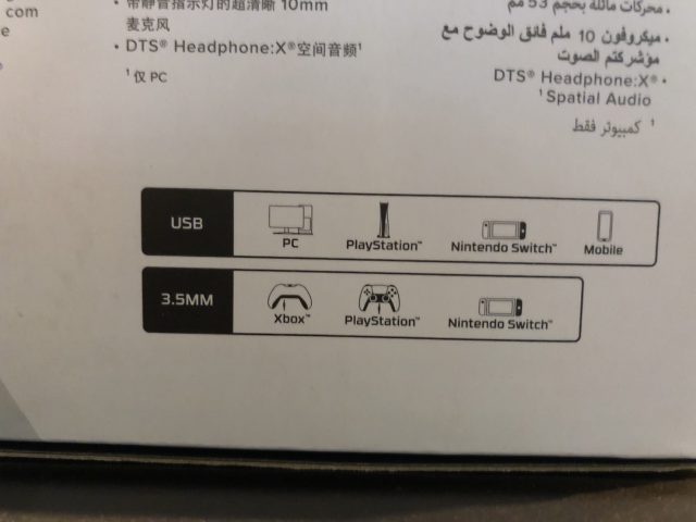 โดยหูฟังตัวนี้ระบุว่าสามารถใช้งานได้กับทุกเครื่องไม่ว่าจะเป็น PC และ Console ทุกรุ่นไม่ว่าจะเป็น PS4-5, XBox, Nintendo switch และมือถือ บนด้านหน้ากล่องและใช้ระบบเสียง DTS V.2.0