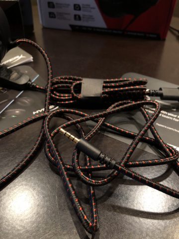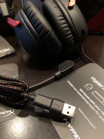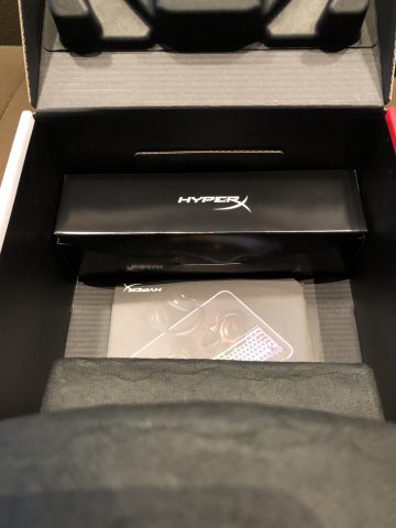 กล่องตัวนี้จะเปิดจากด้านล่างทำให้เปิดไม่ยุ่งยากเหมือนรุ่นอื่นๆ ที่จะต้องเปิดด้านบนละมีฝาพับและต้องเก็บหูหิ้วเข้าที่ทุกครั้งที่เปิดหรือปิดกล่อง เมื่อเปิดออกมาหูฟังจะถูกวางอยู่ในที่วางดำด้านดุดันตามสไตร์ของ HyperX โดยด้านในจะมีกล่อง ของสายอะแดปเตอร์และตัวไมค์ต่อรวมอยู่ด้านใน