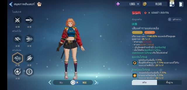 เอมม่า ลอเรน ตัวละคร SSR สายป้องกัน ธาตุไฟ ถึงจะบอกว่าเธอเป็นตัวแทงค์แต่สกิลของเธอจะรุนแรงตามค่า HP สูงสุดของเธอ เลือดยิ่งเยอะก็ยิ่งโจมตีแรง แถมสกิลต่างๆ มาพร้อมกับสกิล CC แน่นๆ แทบจะทุการโจมตีของเธอสามารถ Break มอนส์เตอร์ได้อย่างดี พร้อมการ เผาศัตรูได้อีกต่างหาก หรือหากเป็นตัวละครซัพพอร์ต จะออกมา เพิ่มโล่ป้องกันให้ตาม HP สูงสุดของเธอ แถมยังมีฮีลติดมาด้วย