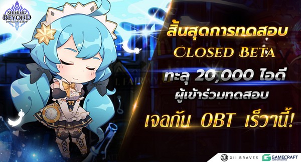 GameCraft ผู้ให้บริการ และ XII Braves ผู้พัฒนาเกม “Shining Beyond” ประกาศสิ้นสุดการทดสอบ Closed Beta เกม Shining Beyond และกล่าวขอบพระคุณผู้เข้าร่วมทดสอบกว่า 20,000 คน ที่ให้ความสนใจและร่วมการทดสอบเกม Shining Beyond ตั้งแต่วันที่ 25 มี.ค. 63 – 8 เม.ย. 63 ที่ผ่านมาเป็นเวลา 15 วันเต็ม ทางเราจะพยายามอย่างดีที่สุด เพื่อปรับปรุงข้อบกพร่องของเกมที่พบระหว่างการทดสอบ และพัฒนาเกมให้ตรงกับความต้องการของผู้เล่นให้มากที่สุดในช่วงเปิดให้บริการเกมในเร็วๆนี้ ระหว่างรอ OBT อย่าลืม! ไปลงทะเบียนล่วงหน้า เพื่อรับคอสตูมชุดนักเรียนสุดลิมิเต็ด และฮีโร่ระดับ SR ฟรี! คลิกลงทะเบียนล่วงหน้าที่นี่: http://www.shiningbeyond.in.th/